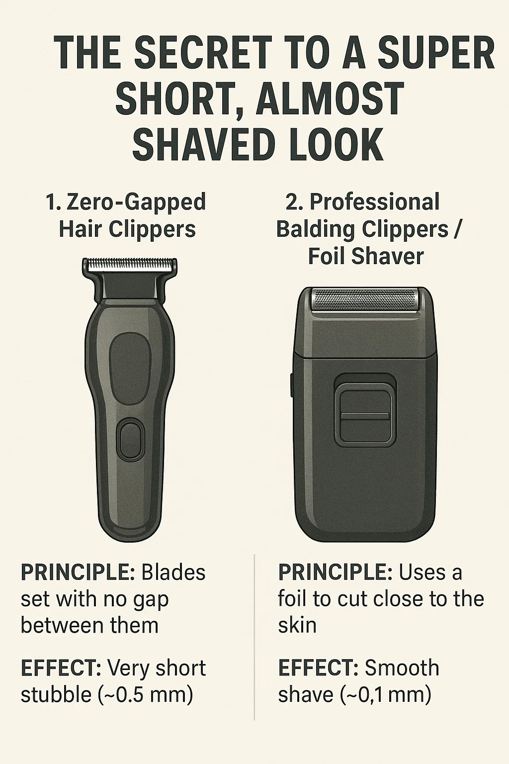 เพื่อให้มีความยาวสั้นมากตามที่คุณอธิบายไว้ ระหว่าง 0.1 มม. ถึง 0.5 มม. ปัตตาเลี่ยนสำหรับใช้ในบ้านทั่วไปและหวีป้องกัน (หวีชี้) จะไม่ทำงาน สิ่งสำคัญคือ: ไม่มีการป้องกันหวี: คุณต้องถอดหวีชี้ออกทั้งหมด เพื่อให้ใบมีดปัตตาเลี่ยนสัมผัสกับผิวหนังได้โดยตรง